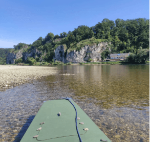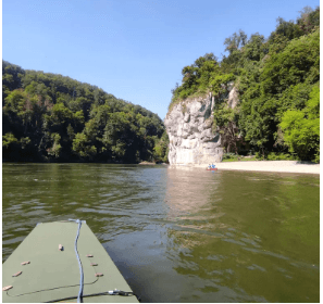 Na miejsce startu wyprawy wybrałam Klasztor Weltenburg. Dojechaliśmy tam rano z moim mężem i planowaliśmy zwodować łódkę. Na miejscu okazało się, że w klasztorze jest jakaś impreza i droga dojazdowa jest zamknięta, więc musieliśmy wodować się w zaroślach i w mule. To już chyba tradycja, że przy starcie zdarzają się nieoczekiwane zmiany miejsca wodowania. Pakowanie łódki zajęło nam około godzinę, o 10:30 zjedliśmy zupę w ramach drugiego śniadania i Krzysiek zaczął wracać samochodem do domu, a ja wyruszyłam w drogę. Faktycznie ten klasztor to dość niesamowite miejsce, znajduje się w przełomie Dunaju. Przypomina to trochę przełom Dunajca, rzeka meandruje pomiędzy skałami. Różnica jest taka, że na Dunajcu musisz uważać na kamienie w nurcie, a na Dunaju na wielkie statki wycieczkowe! Przy dłuższych wyprawach po nieznanej rzece, zwykle kilka dni zajmuje poznanie się z nią i wpadnięcie w rytm płynięcia. Każda rzeka jest inna, więc każda wyprawa też ma trochę inny rytm.