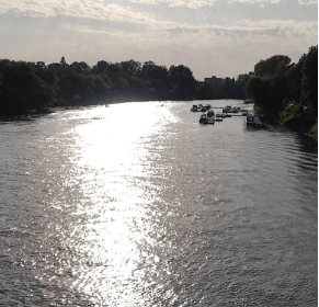 Nocleg spędziłam w klubie kajakowym, było to jedyne miejsce gdzie można się było zatrzymać. Natomiast żeby się dostać do klubu, trzeba było dobić do kamiennych schodów, które są częścią gigantycznej wysokości wału. Na szczęście było sporo kajakarzy w pobliżu, ani się obejrzałam już przenieśli mi łódkę i dobytek. Zagadką natomiast jest jak jutro rano przedostanę się w drugą stronę. Ale będę się nad tym zastanawiać jutro. O ile w ogóle jutro będę wypływać, bo mają być burze i deszcz.