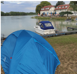 Śpię dzisiaj w klubie motorowodnym Campingplatz/Marina Obernzell. Łódka zacumowana na wyznaczonym miejscu, została na wodzie. Dużo wygodniej jest, gdy nie muszę wyciągać łódki z wody na noc. Namiot też mogłam rozbić blisko łódki, więc nie musiałam daleko nosić bagaży. Tak jest dużo wygodniej. Na Dunaju, żeby łódka mogła zostać na wodzie, musi znajdować się w wewnętrznym porcie. W nocy pływają statki wycieczkowe i barki, więc zostawianie łódki w głównym nurcie nie wchodzi w grę. Zresztą, wszystkie mariny i porty są tak zbudowane, że łódki są schowane przed falami za falochronem.